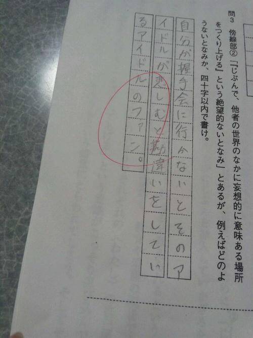 話題になっている解答は「自分が握手会に行かないとそのアイドルが悲しむと勘違いをしているアイドルのファン。」というもの。