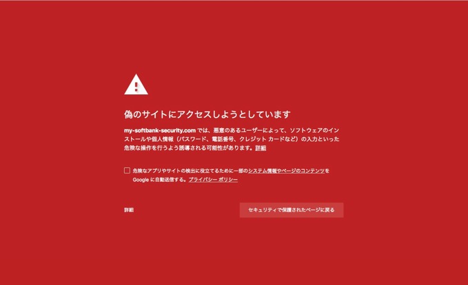 パソコンのブラウザ(Chromeなど)でアクセスすれば「偽のサイトにアクセスしようとしています」と警告が出るので一目瞭然。