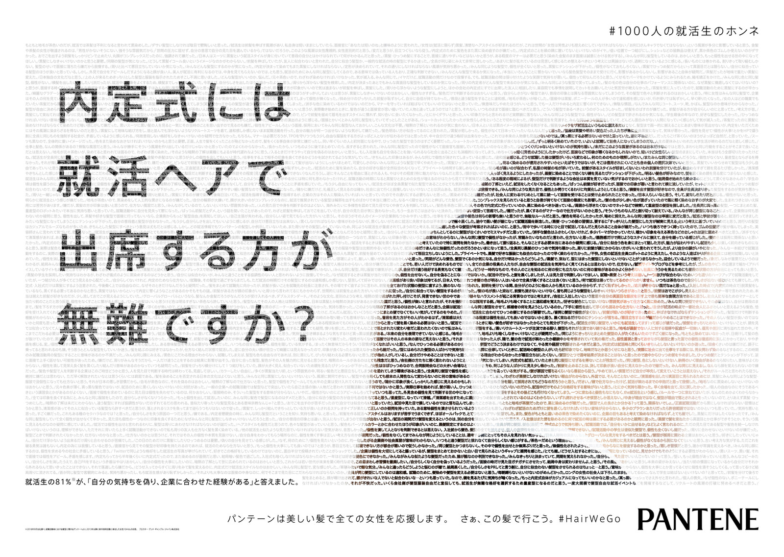 パンテーンが展開する広告キャンペーンがネットで話題になっています。全国の就職活動経験者の1000人に行った"就職活動のホンネ"調査の結果をうけ、就活生が「現代の就活生が、ありのままの姿で、自分らしく就職活動ができるように」という思いを込めたキャンペーンとのこと。