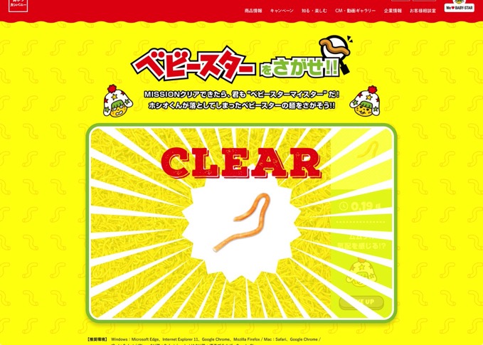 これは2018年4月にい行われたキャンペーンで作られたサイトで、ベビースターのキャラクター・ホシオくんが落としてしまったベビースターと同じ形のベビースターを探すというゲーム。
