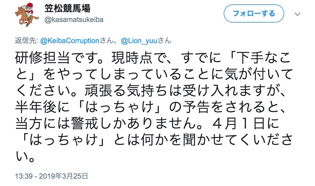 さらに笠松競馬場公式Twitterは「あと半年は仮採用なので下手なことは出来ないんですが、本採用になったら、はっちゃけたいと思ってます」という別の会話にも割り込み、「現時点で、すでに『下手なこと』をやってしまっていることに気が付いてください。頑張る気持ちは受け入れますが、半年後に『はっちゃけ』の予告をされると、当方には警戒しかありません。4月1日に『はっちゃけ』とは何かを聞かせてくいださい」と説教を続けました。