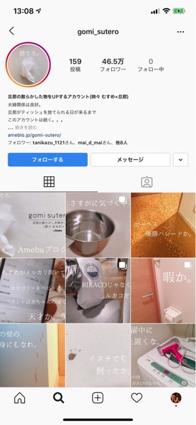 Instagramで約46.5万人フォロワーを誇るアカウント「gomi_sutero」をご存知だろうか。アカウントのホーム画面を見ると、パッと見ではお洒落なアカウントに見えますが、よく見てみると「旦那の散らかした物をUPするアカウント」。独特な投稿が多くのユーザーから人気を博しています。