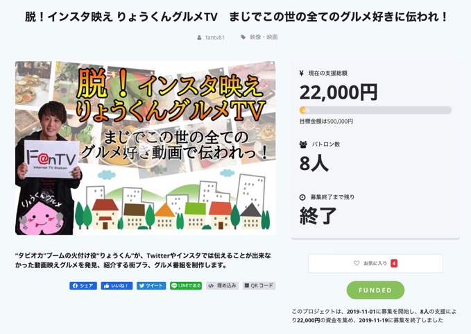 注目されたクラウドファウンディングは全世界配信インターネットテレビ局「F@nTV」が実施したもので、りょうくんが「脱!インスタ映え」を掲げるグルメ番組を制作するという内容でした。