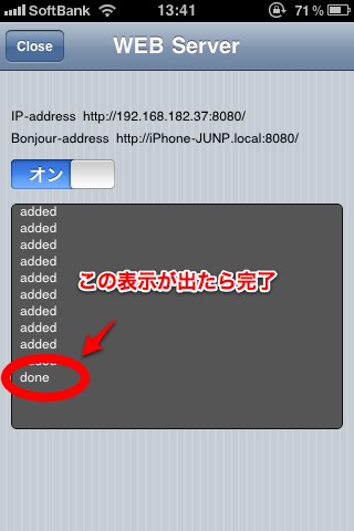 起動したら画面左下のiを押して設定メニューを出します。設定のWEBサーバーをタップ。