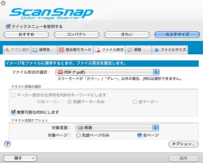 まずはScanSnap Managerの設定を変更しました。PDFではなくjpgにしたほうがデータが軽くて済むし今回はjpgで。と思ったらjpgがグレーアウトして選択できない?!