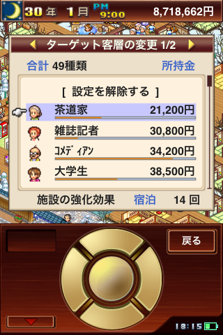 基本的なゲームの流れは「宣伝」をしてある客層をターゲットに営業する、平行してアイテムを買ったり、施設を増築したり環境の整備をしてお客からの人気をあげる。