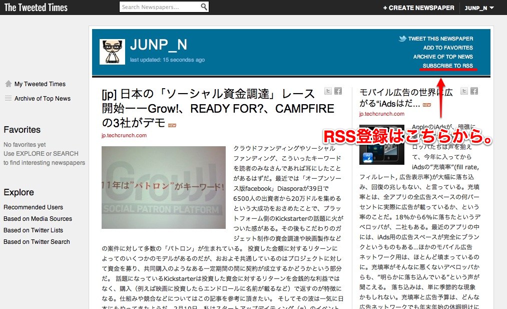 | The Tweeted Times - personal newspaper generated from your Twitter account The Tweeted Times aggregates news in your Twitter stream and ranks them by popularity among your friends. Never loose any important news! まずはサイトへアクセスしてみてください。 |