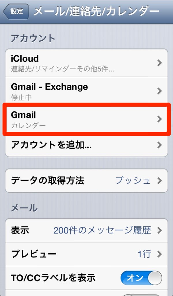 (1)まずは設定アプリから「メール/連絡先/カレンダー」を選択します。