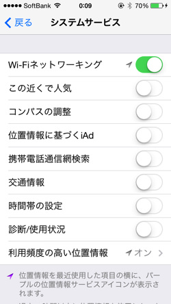 ![]() | 意外に気づきにくい項目ですが、iOSのシステムで利用している機能も不要なものはオフにしておくとバッテリーには優しいです。 |