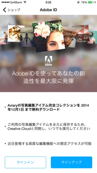 Adobe IDを登録すると2014年12月1日まですべての写真編集アイテムを無料で提供していると表示されます。