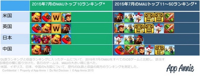 日本では圧倒的な人気を誇っている「パズル アンド ドラゴンズ」「モンスターストライク」ですが、MAUを基準にした利用状況ランキングでは上位に入っているのは日本だけでした。