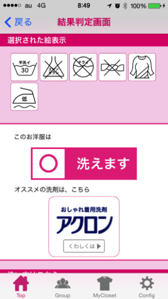 洗濯マークをタップしていくだけで、その洋服を自宅で洗濯できのか教えてくれます。ちゃんと「ライオン」のオススメ洗剤も表示するところが企業のアプリ的です。