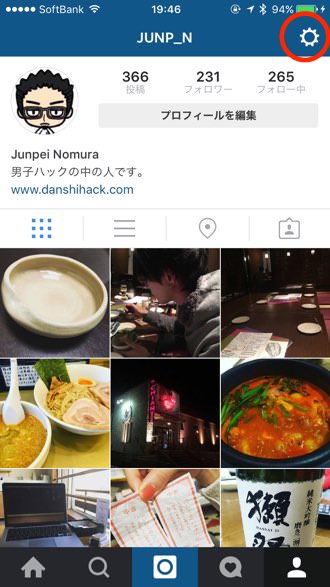 プロフィール画面右上をタップし、設定画面を表示させます。