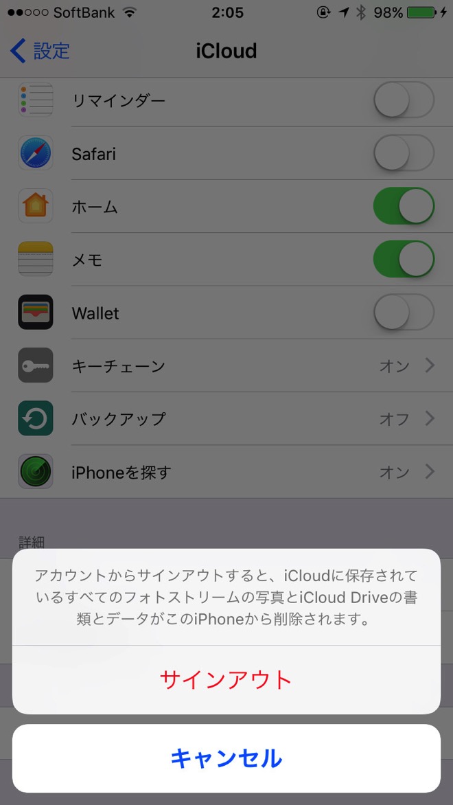 この後はiCloudからサインアウトします。1つ前の画面に戻り、画面下部にある「サインアウト」をタップ。表示された「サインアウト」を選択します。