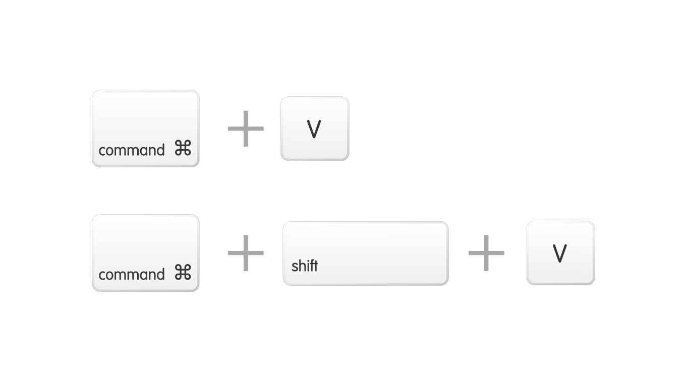 「command + V」は、コピー(切り取り)していたファイルや文章を「貼り付ける」ためのショートカット。コピーとセットで覚えておくべきショートカットです。「command + shift + V」とすれば、コピーしていたものに「書式」が付いてしまっていも"書式なしで貼り付ける"ことができます。