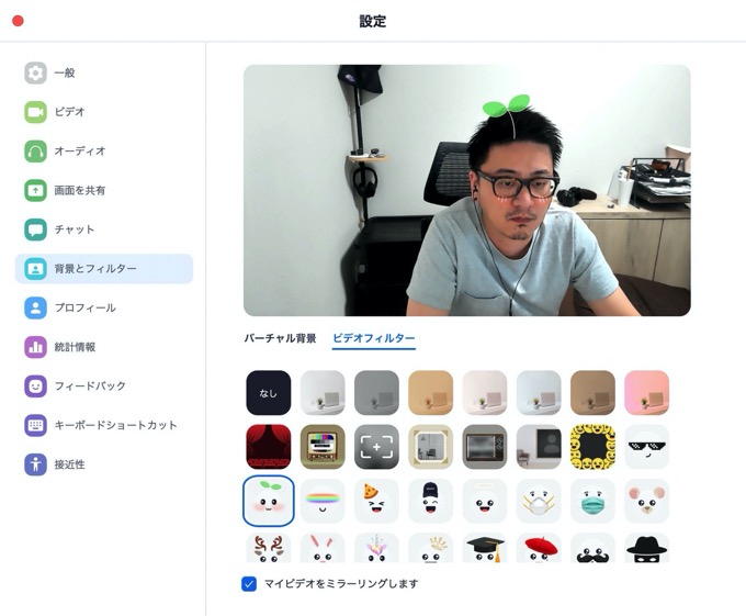 Snap Cameraのようばビデオフィルター機能も追加。カメラの設定から「ビデオフィルターを選択」をクリックすることで、設定画面が表示されます。