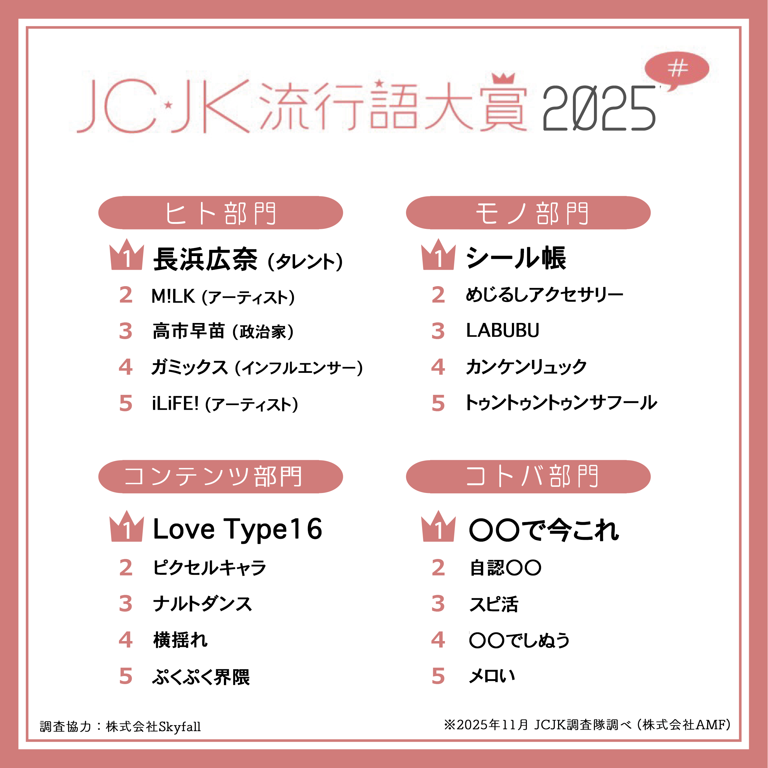 株式会社AMFが、2025年のJC・JK流行語大賞が発表しています。"モノ"部門では「シール帳」、"コンテンツ"部門では「Love Type 16」が1位となり、SNSや学校生活を中心に広がった流行がランキングに反映されています。